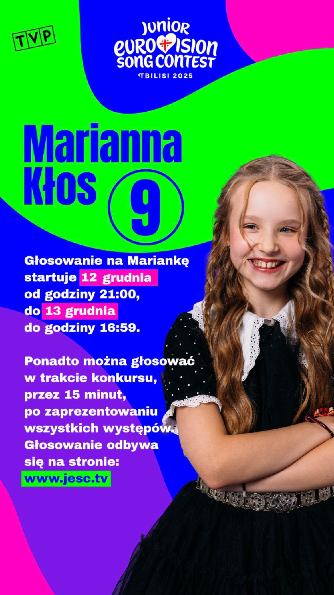 Bezpłatny głos na Mariannę Kłos, reprezentantkę Polski, można oddać na stronie www.jesc.tv. Głosowanie rozpocznie się 12 grudnia o 21:00 i potrwa do 13 grudnia do godziny 16:59, a także 15 min po występie wszystkich uczestników podczas finału. Konkurs można oglądać w najbliższą sobotę od godziny 17:00 w TVP2, TVP VOD, TVP ABC. Głosowanie jest darmowe i Polacy mogą głosować na swojego reprezentanta.